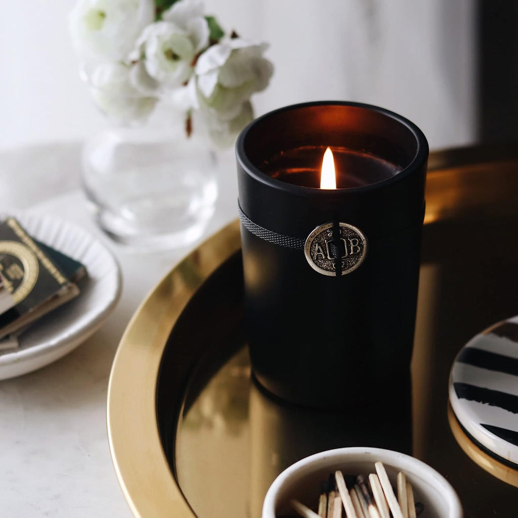Scented Candle: Transform any room with the dark and sweet scent of dark ebony wood, Douglas Fir and black currant; Decorative candle comes in an elegant and heavy glass container