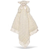 CUTE AND CUDDLY: Super soft ultra premium cream swirly fabric security blanket with cream satin lining, combined with a cute lamb stuffed animal head and arms, machine washable